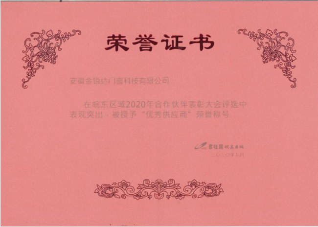 熱烈祝賀我司榮獲碧桂園皖東區(qū)域2020年“優(yōu)秀供應(yīng)商”榮譽(yù)稱號(hào)