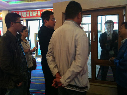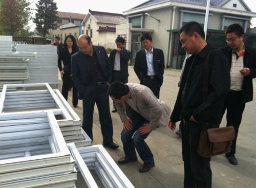 參觀人員查看宏夏公司生產(chǎn)的半成品塑鋼門(mén)窗